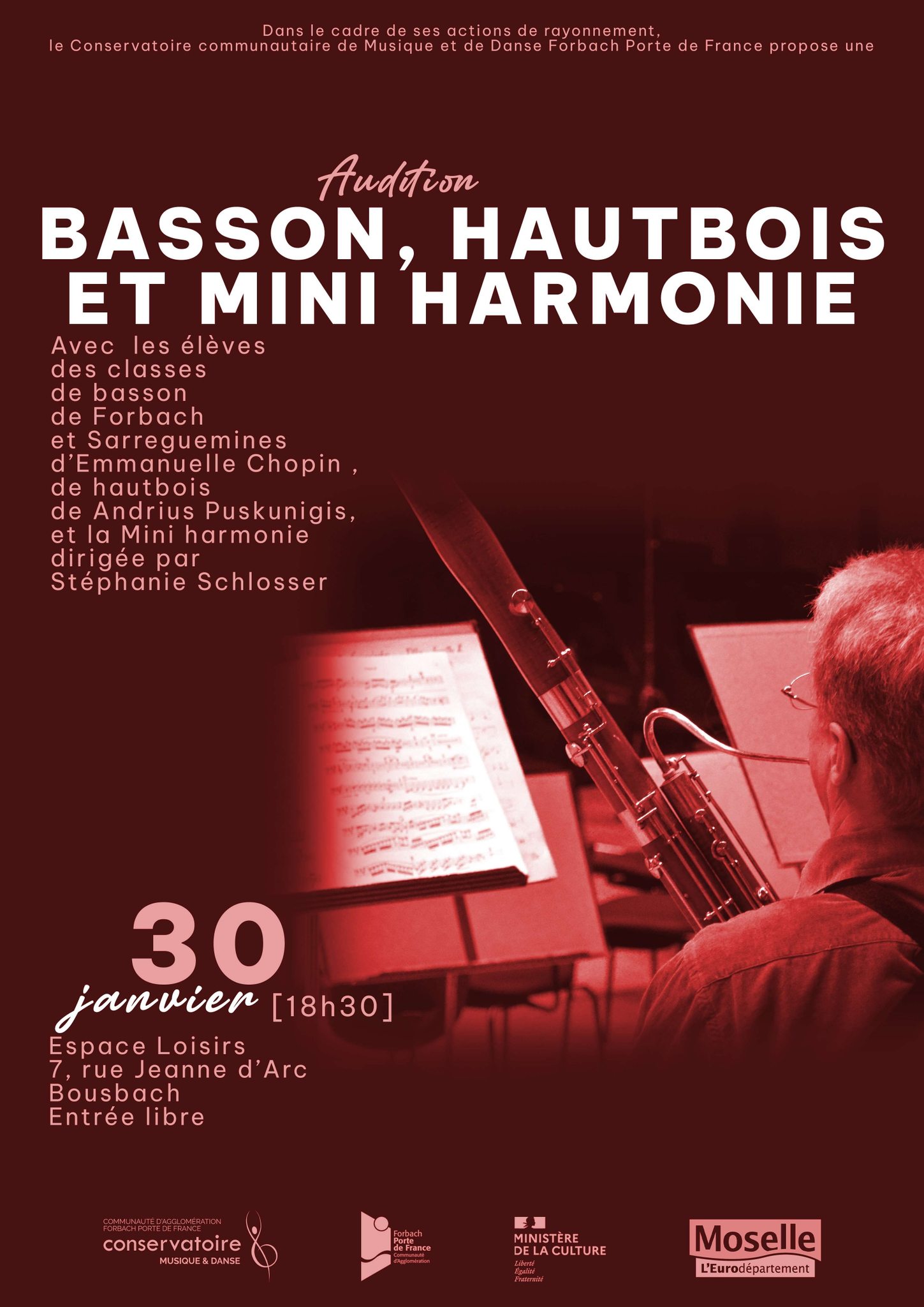 Dans le cadre de ses actions de rayonnement, le Conservatoire Communautaire de Musique et de Danse Forbach Porte de France vous propose une audition BASSON, HAUTBOIS ET MINI HARMONIE à 18h30 le vendredi 30 janvier 2026 à l'Espace Loisirs de Bousbach.