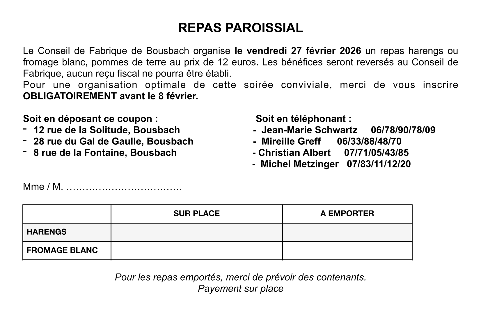 Le Conseil de Fabrique de Bousbach organise le vendredi 27 février 2026, à partir de 19h à l'Espace Loisirs, un repas harengs ou fromage blanc, pommes de terres, au prix de 12 €. Les bénéfices seront reversés au Conseil de Fabrique ; aucun reçu fiscal ne pourra être délivré.