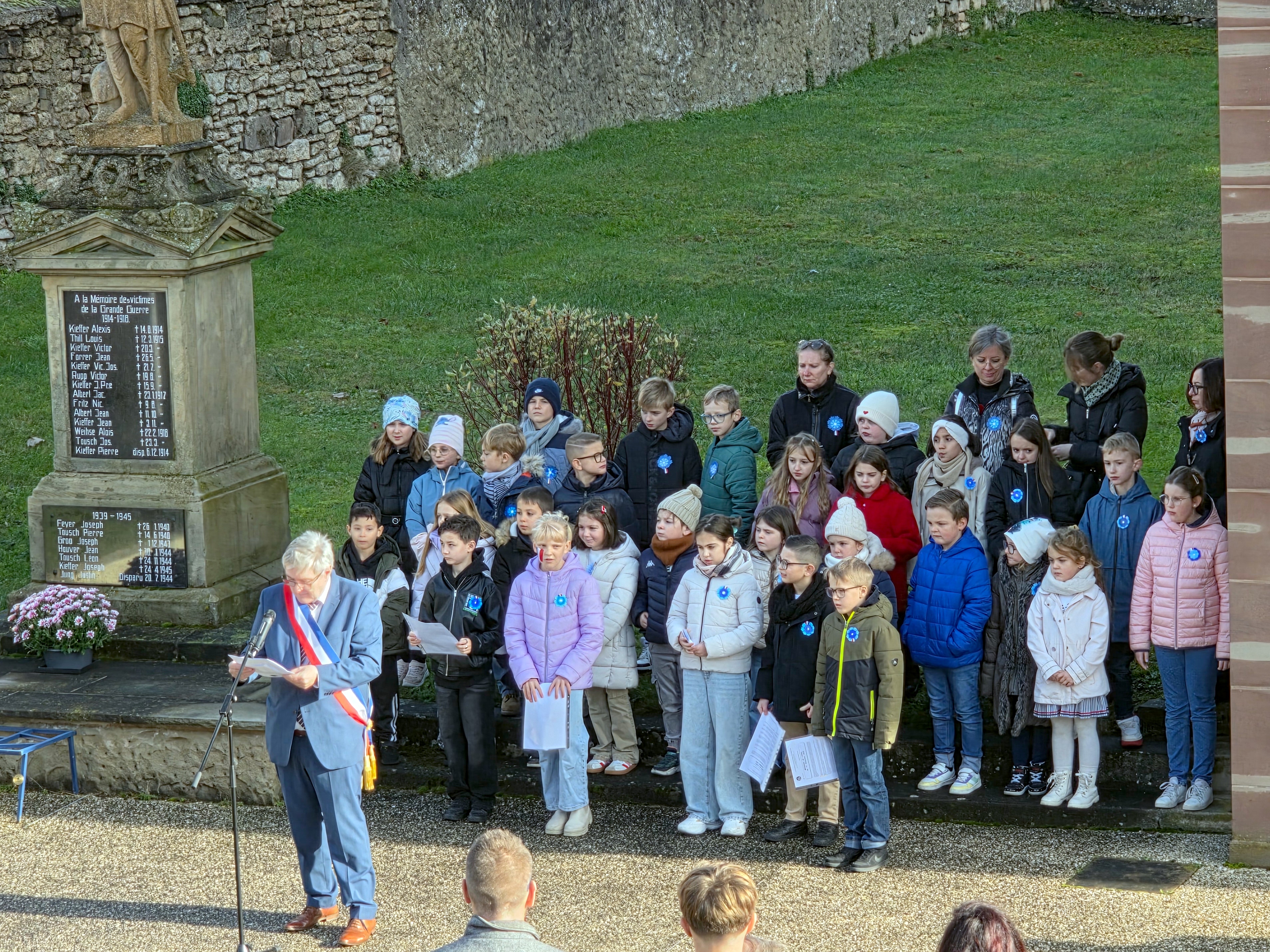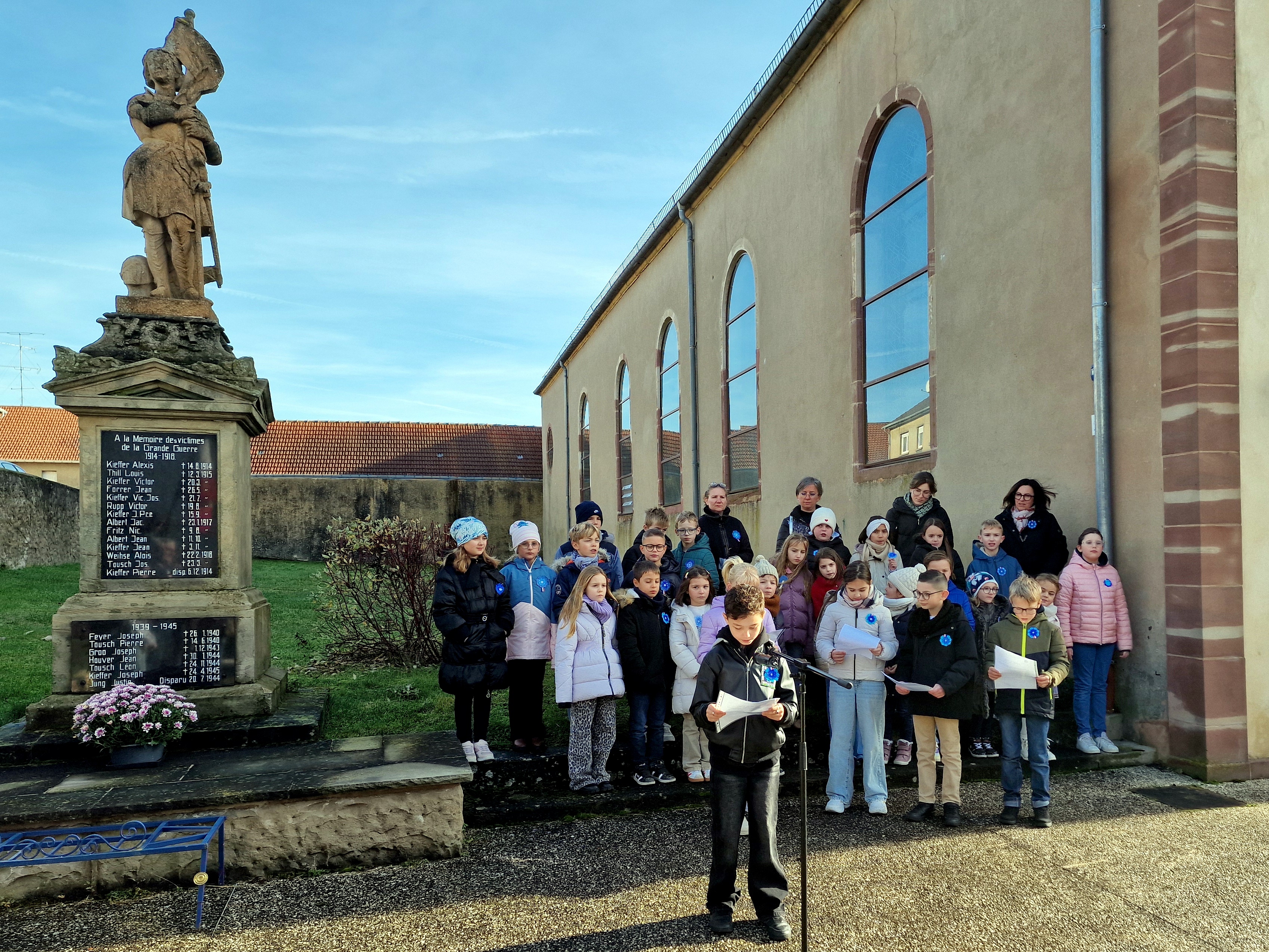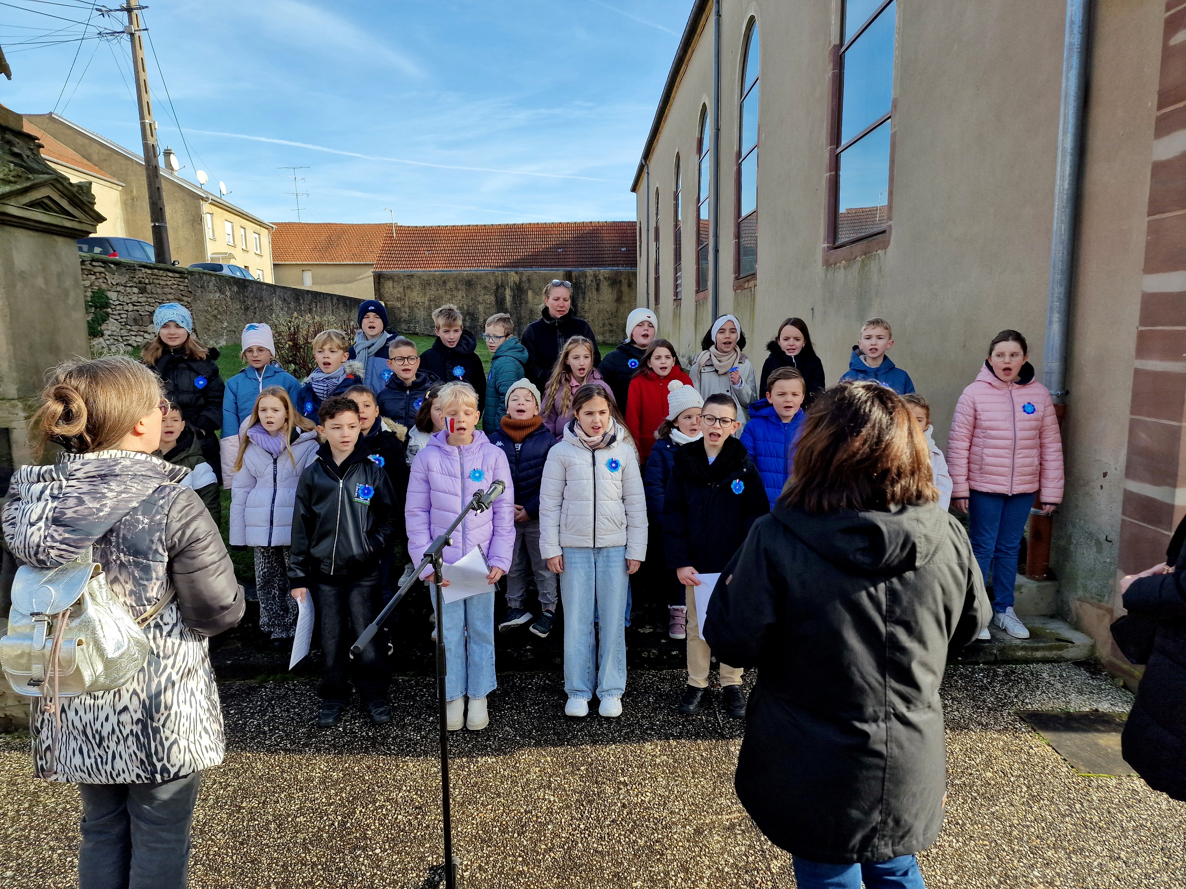 Les élèves Chiara, Noham, Alina, Timothée et Andréa ont tout d'abord lu le message de l'Union Française des Associations de Combattants et de Victimes de Guerre. Le Maire Constant KIEFFER a ensuite procédé à la lecture du message ministériel, avant de déposer, avec la Conseillère Départementale Junior Jade FERSING, la gerbe au pied du monument aux Morts. Après un instant de recueillement, les enfants de l'école ont chanté la Marseillaise, sous la direction des enseignantes de l'école l'élémentaire. En soutien aux victimes de guerre et du terrorisme, les enfants avaient arboré chacun un Bleuet confectionné par leurs propres soins. Les personnes présentes ont été invitées à partager le verre de l'amitié à la Maison Mérignac.