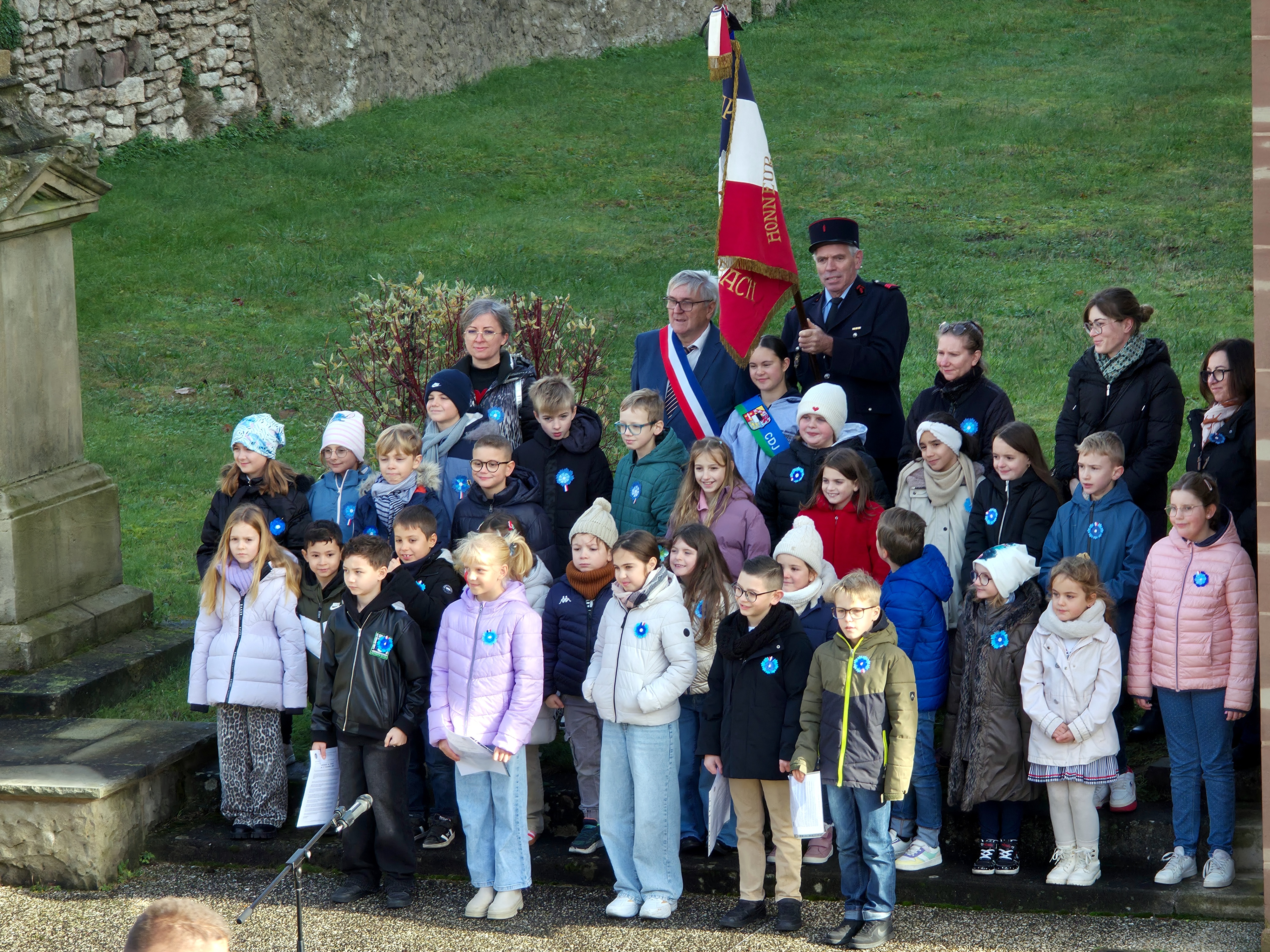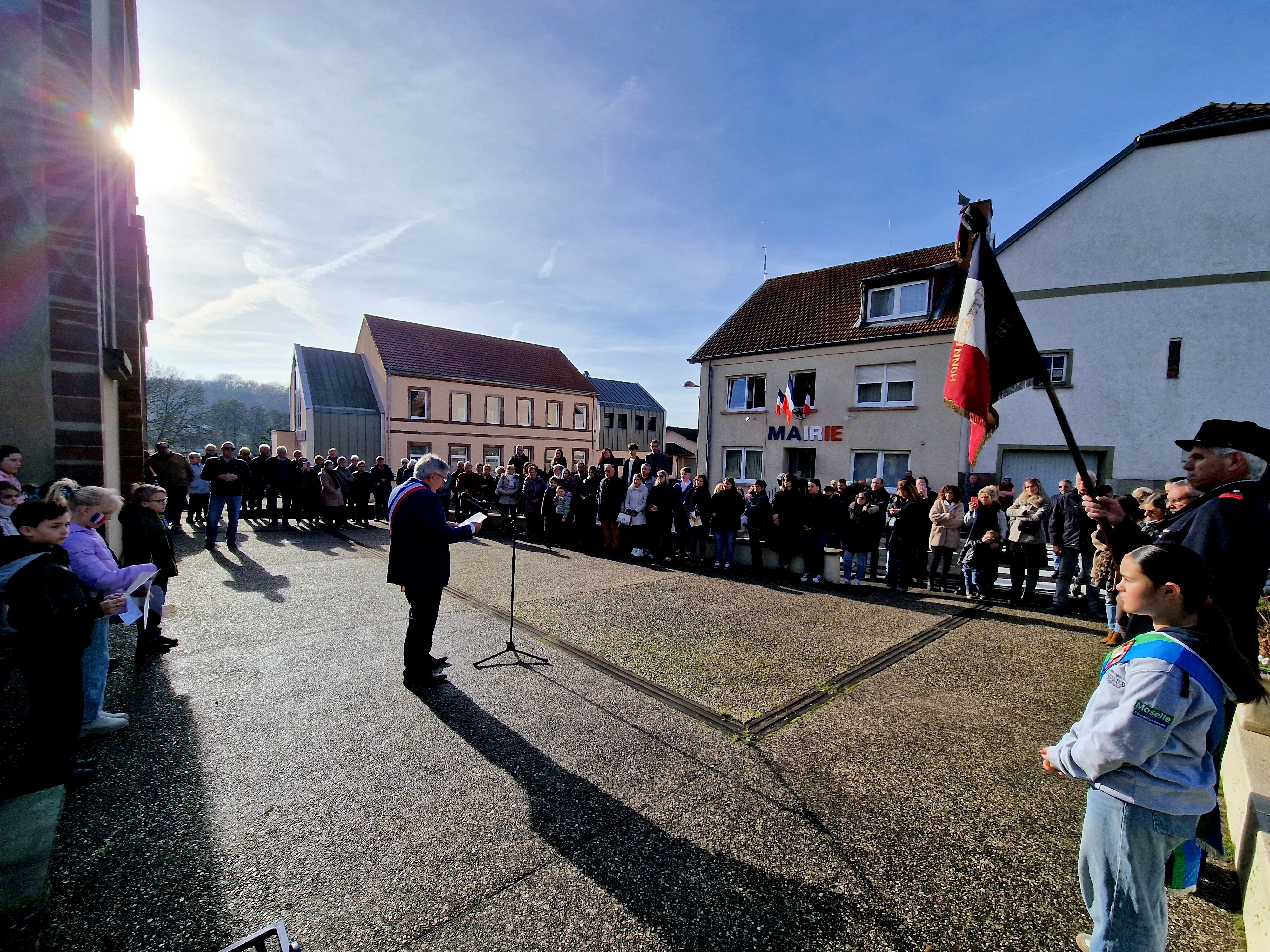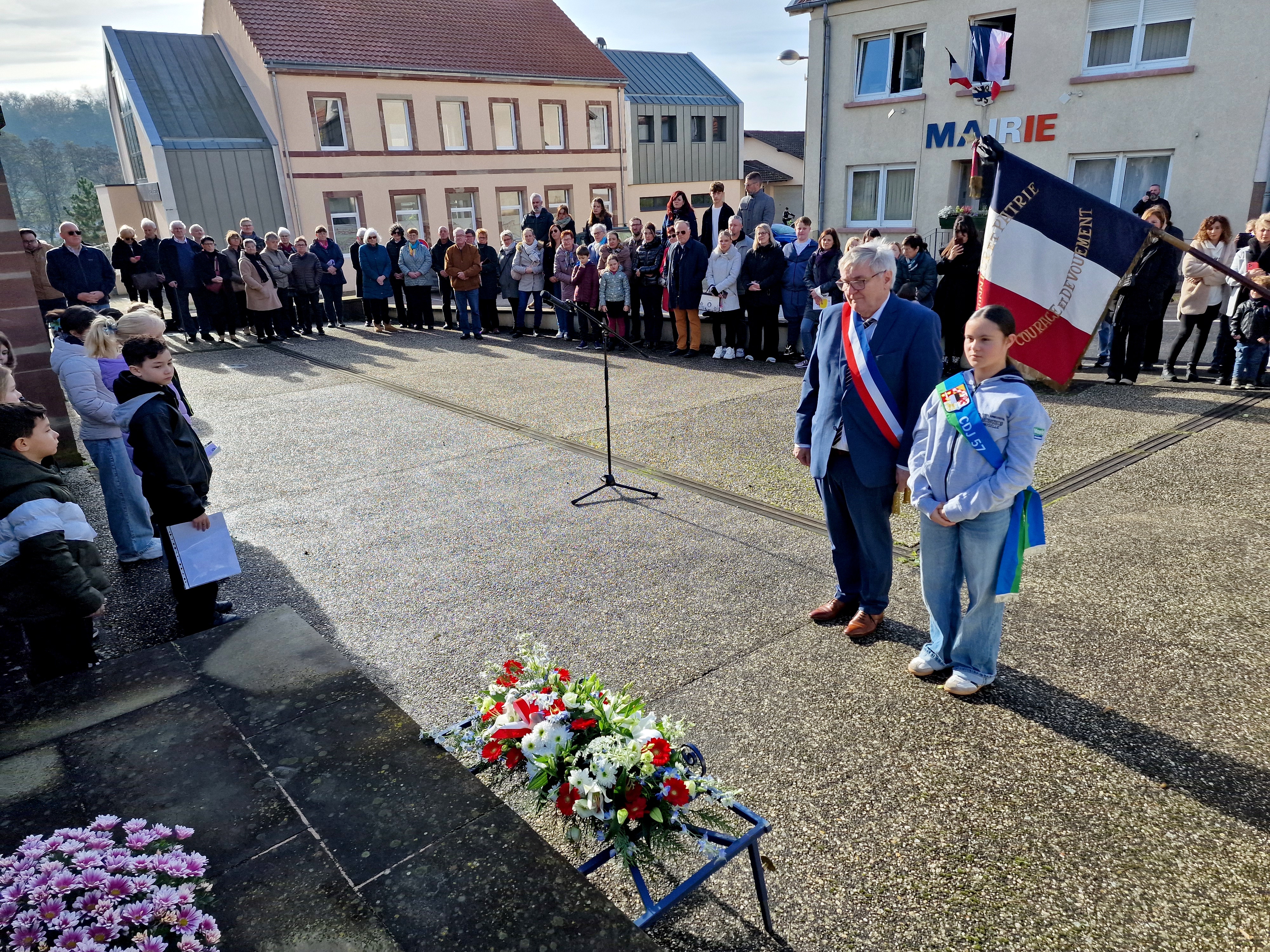 Les élèves Chiara, Noham, Alina, Timothée et Andréa ont tout d'abord lu le message de l'Union Française des Associations de Combattants et de Victimes de Guerre. Le Maire Constant KIEFFER a ensuite procédé à la lecture du message ministériel, avant de déposer, avec la Conseillère Départementale Junior Jade FERSING, la gerbe au pied du monument aux Morts. Après un instant de recueillement, les enfants de l'école ont chanté la Marseillaise, sous la direction des enseignantes de l'école l'élémentaire. En soutien aux victimes de guerre et du terrorisme, les enfants avaient arboré chacun un Bleuet confectionné par leurs propres soins. Les personnes présentes ont été invitées à partager le verre de l'amitié à la Maison Mérignac.