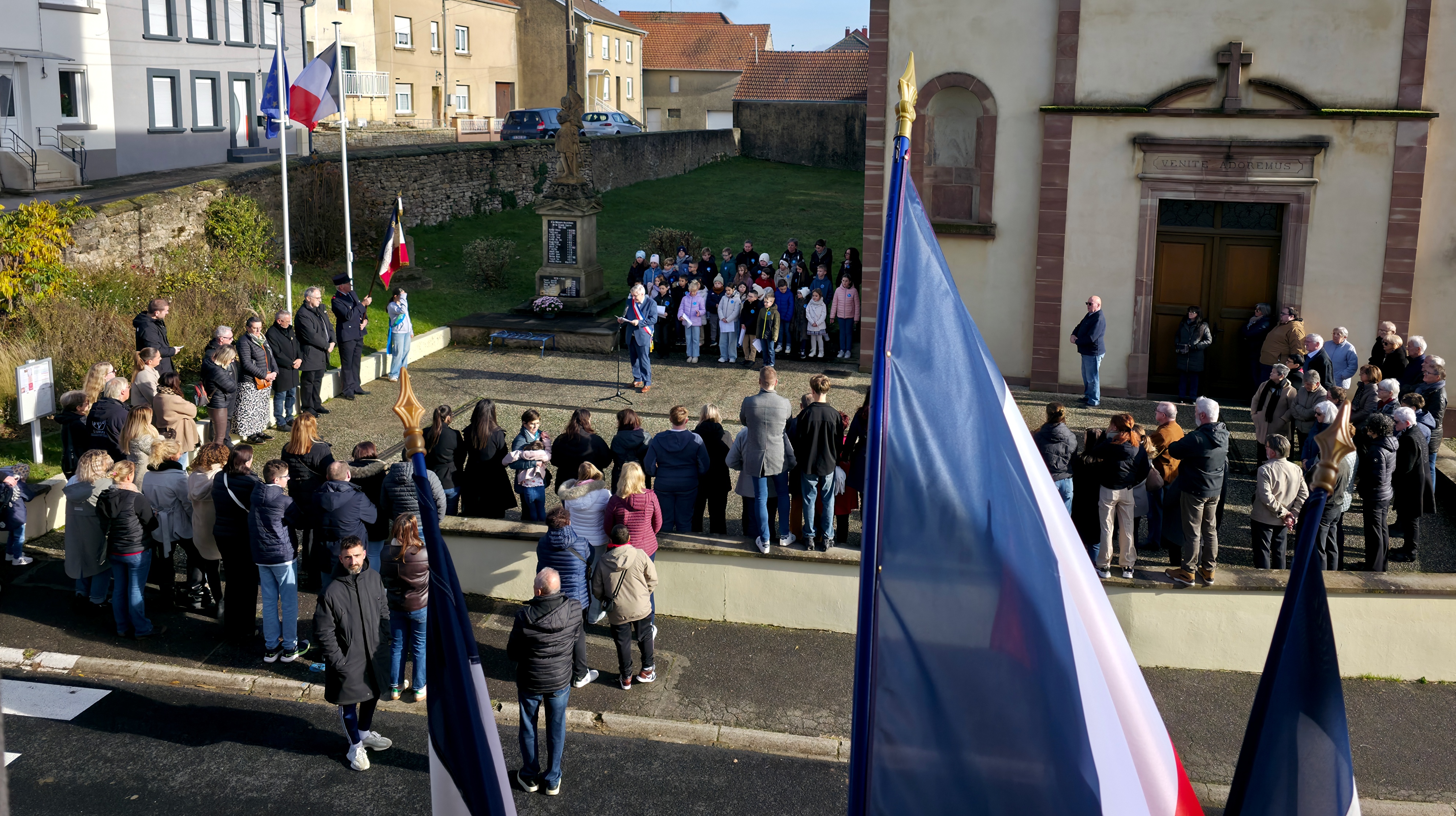 À l'issue de la messe pour la France célébrée par l'abbé Noël BADO, la cérémonie civile a eu lieu devant le monument aux Morts sur le parvis de l'église. La foule était venue en nombre pour assister à la commémoration et pour soutenir les enfants de l'école de Bousbach participant à l'événement.