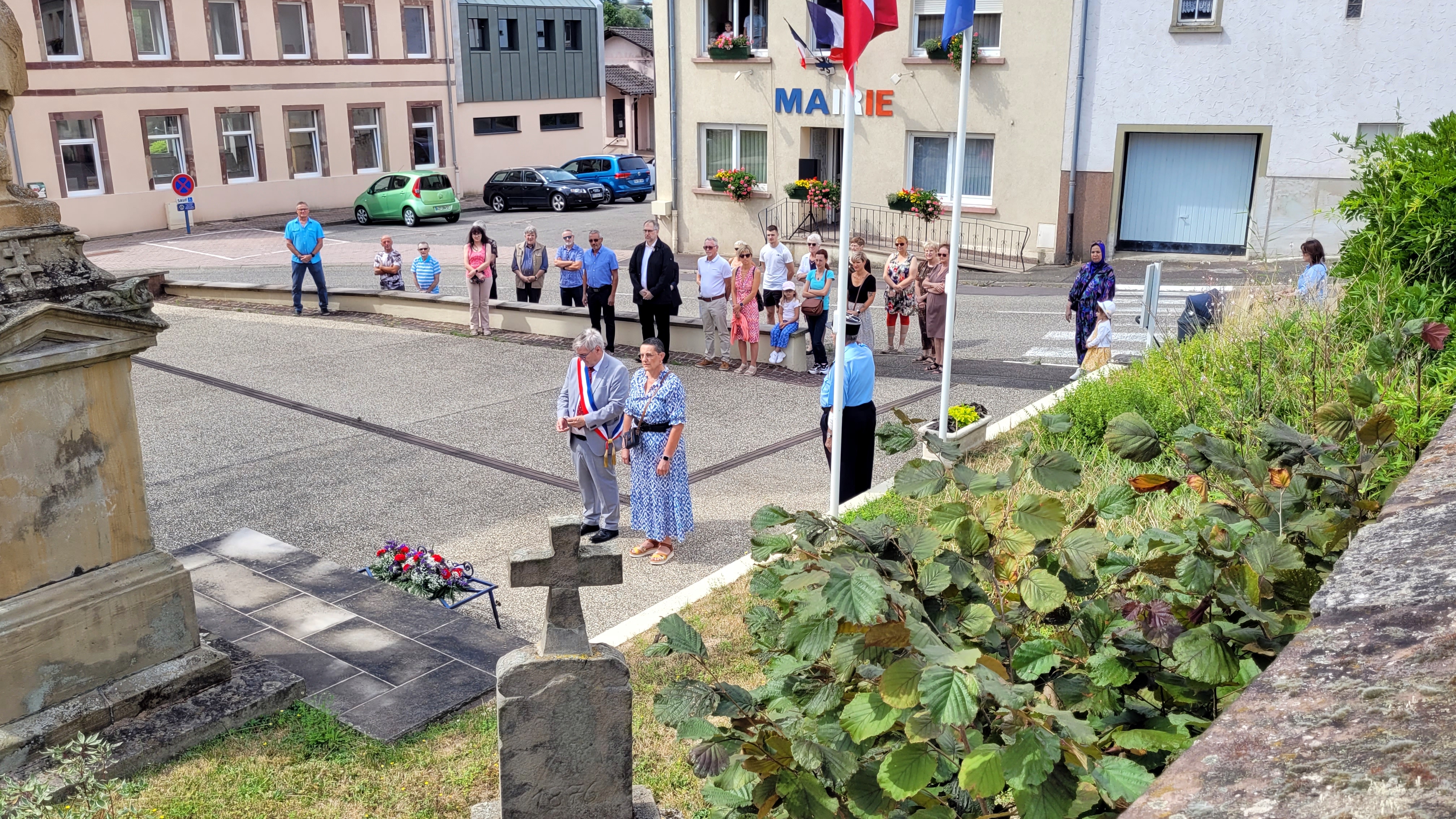 C’est par un temps clément et agréable qu’a été célébrée la Fête nationale à Bousbach. À l’invitation de la municipalité, les participants se sont retrouvés sur le parvis de l’église. Après un chant interprété par la chorale paroissiale, le Maire Constant KIEFFER et sa première adjointe Brigitte STUPFLER ont déposé une gerbe devant le monument aux Morts. À l’issue de la cérémonie, l’ensemble des personnes présentes a été invité à partager un moment de convivialité à la Maison Mérignac pour le traditionnel vin d’honneur.