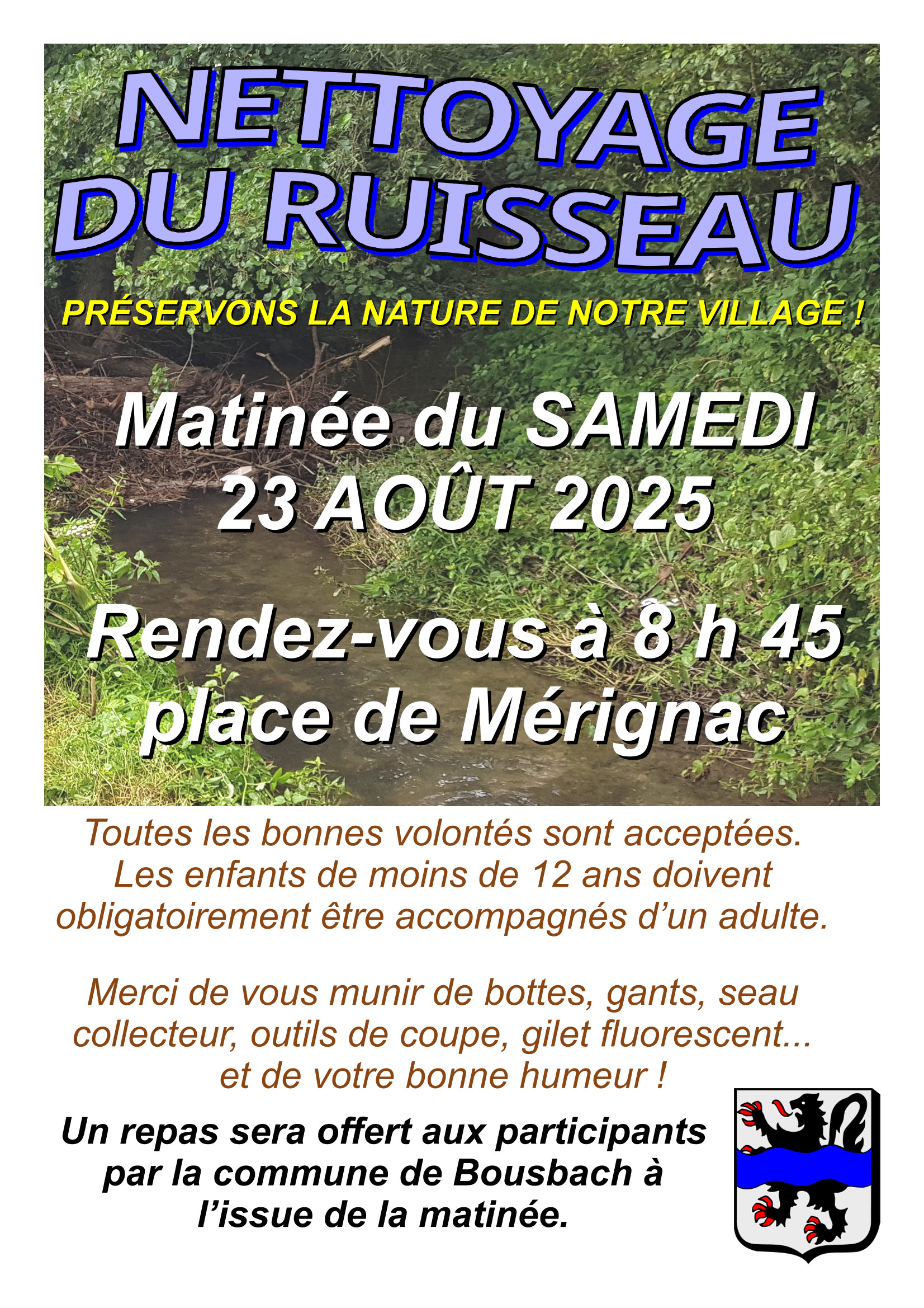 Comme chaque année, la municipalité sollicite la participation de bénévoles à une opération de nettoyage du ruisseau qui se déroulera le samedi 23 août 2025. L'opération consistera à maintenir le lit du ruisseau et ses berges en bon état.