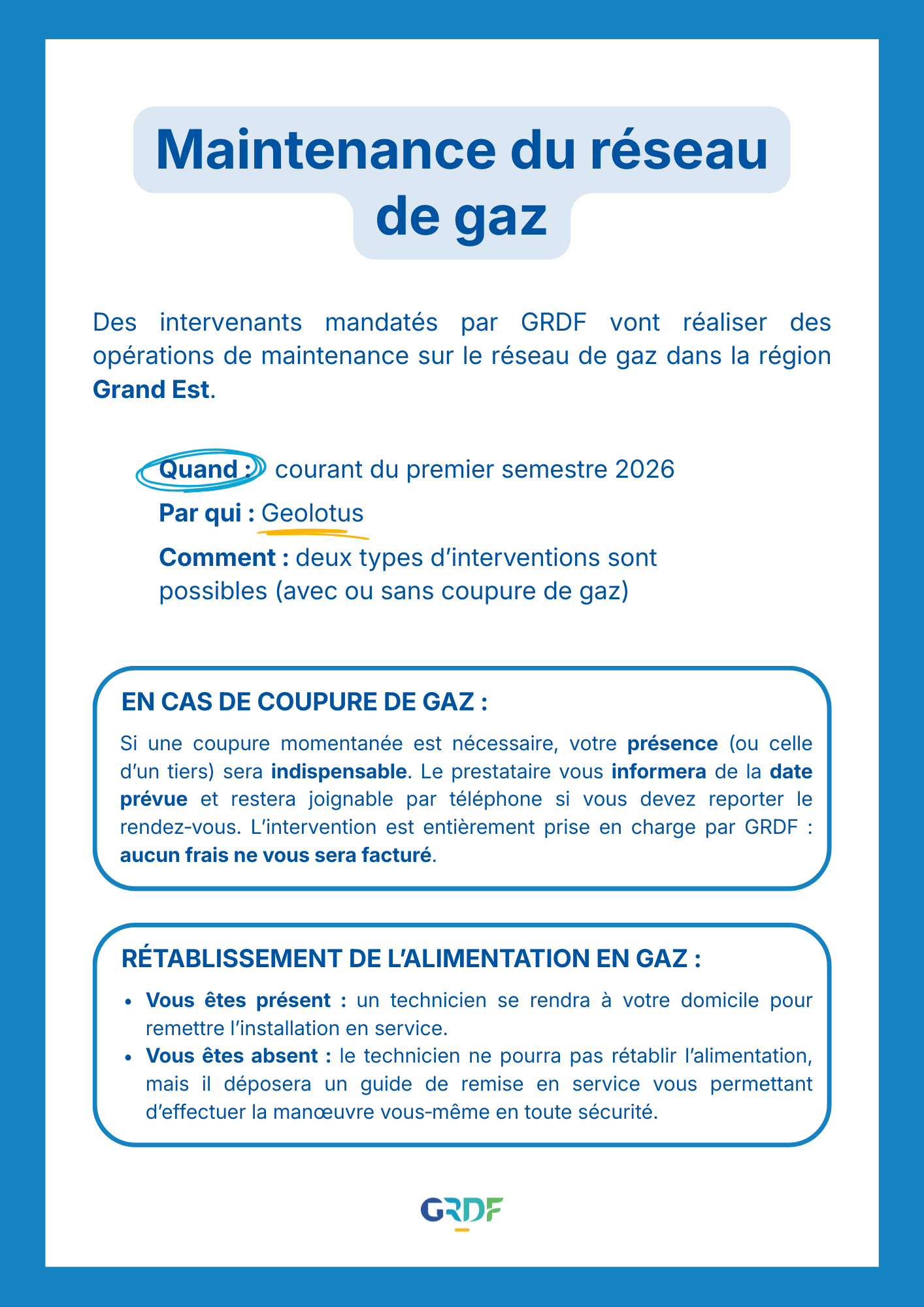 Certaines interventions pourront nécessiter une coupure momentanée du gaz ; la présence de l'abonné sera nécessaire pour la remise en service. Le prestataire GEOLOTUS vous informera de la date prévue de coupure (avec la possibilité de reporter le rendez-vous à domicile, pour remettre l'installation en service). En cas d'absence, un guide de remise en marche sera déposé pour remettre en service l'alimentation en gaz en toute sécurité.